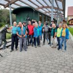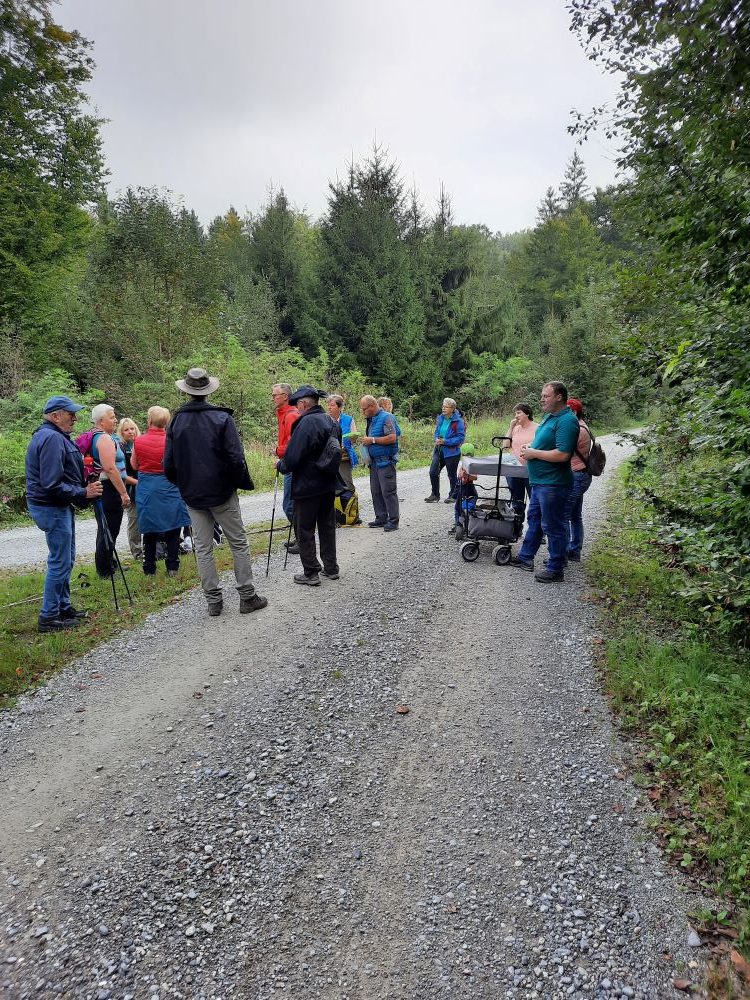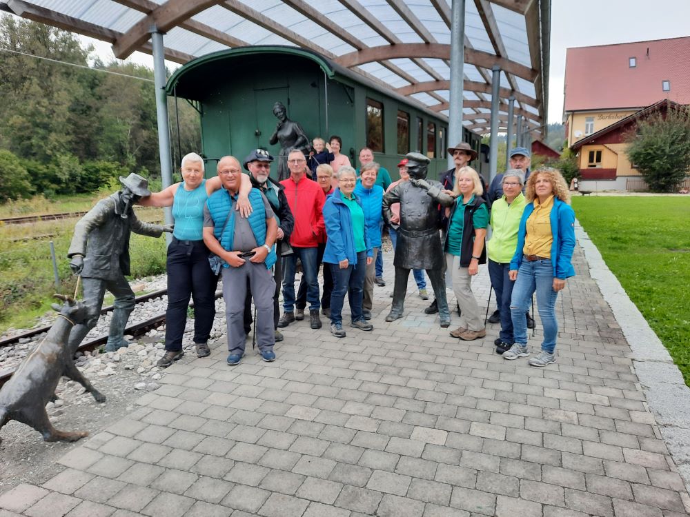 Wanderung im Schussentobel . Ausgangspunkt waren die Fischweiher bei Reutte und es ging bergab in den Schussentobel , durch den Röschenwald zur ehemaligen Holzschleife , hier wurde Fichtenholz zur Papierherstellung geschliffen. Weiter zum ehemaligen Bahnhof Durlesbach. Beim Bahnhof Durlesbach steht auf dem Abstellgleis der Museumszug mit dem Bäuerlein , dem Geißbock , dem Weiblein und dem Kondukteur.Wanderführer war Franz Bolz.