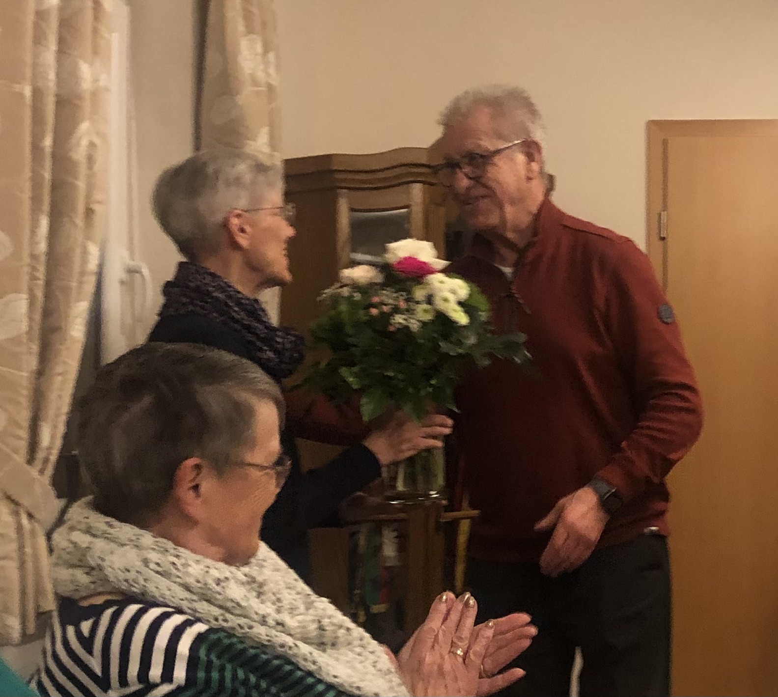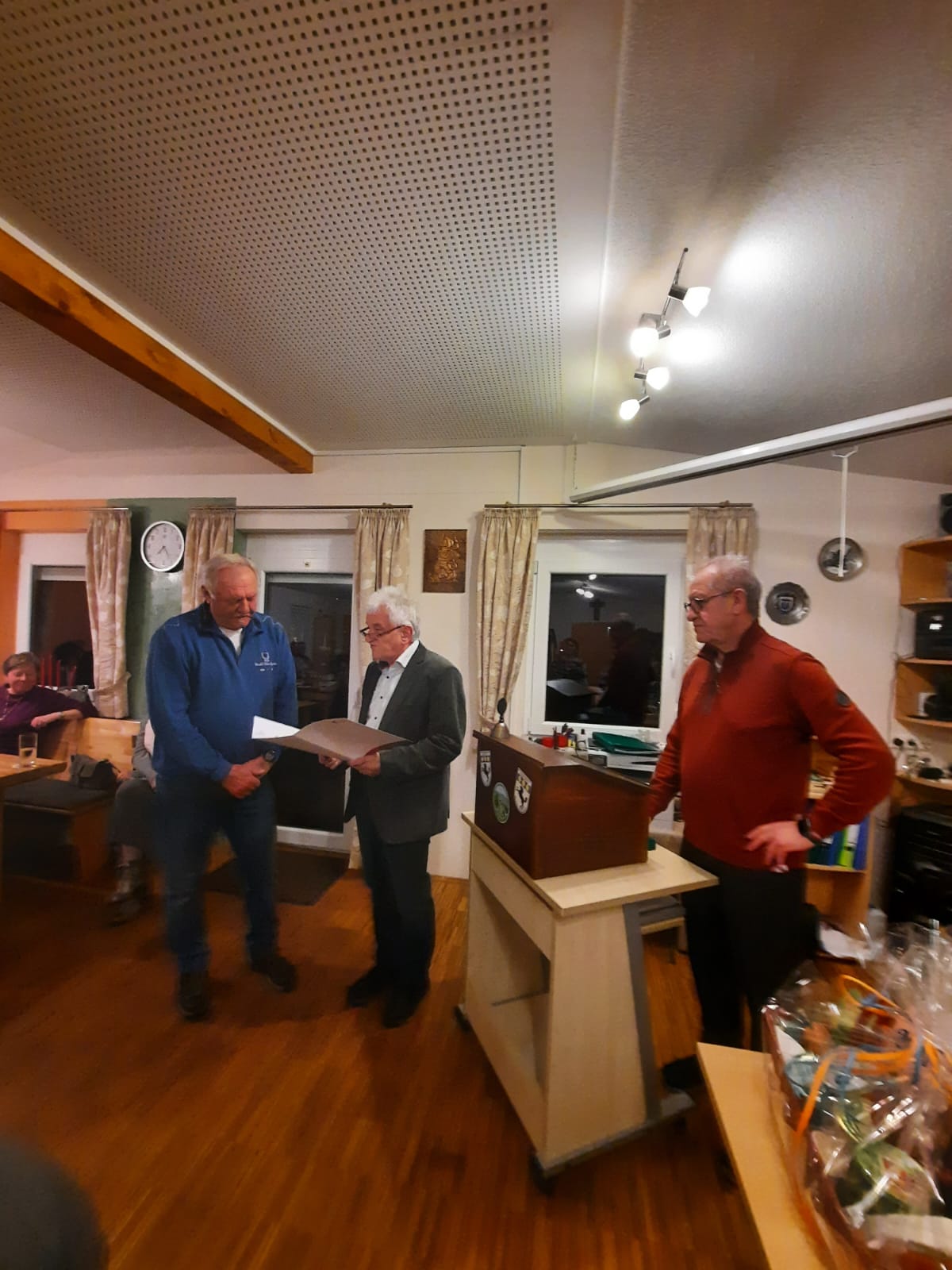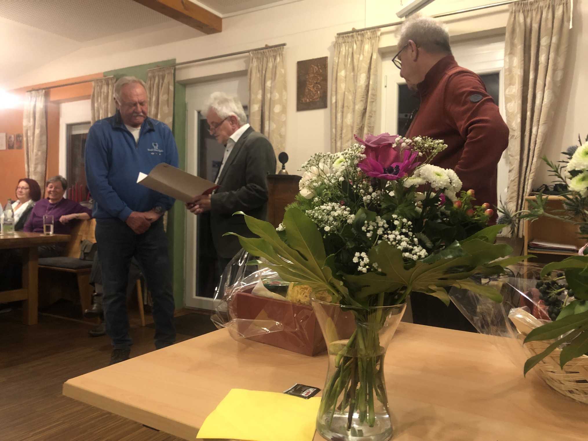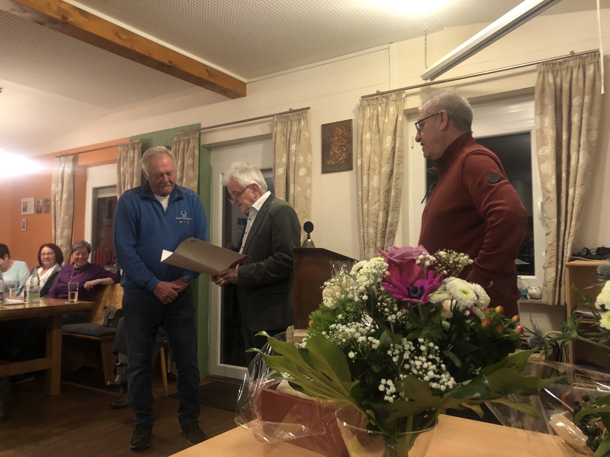 Die anstehenden Ehrungen wurden von Herrn Helmut Geiselhart, Vorstand des Donau-Bussen-Gaus, und Vorstand Karl-Heinz Juchems vorgenommen. Den Jubilaren wurde eine Anstecknadel sowie eine Urkunde des Schwäbischen Albvereins überreicht.  Von der Ortsgruppe gabs Blumen und Geschenkkörbe. Geehrt wurde, für 50 Jahre Gerd Junghans und für jeweils 25 Jahre Karl-Heinz Kley, sowie Walter, Jutta und Maximilian Haimerl.