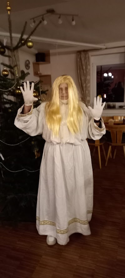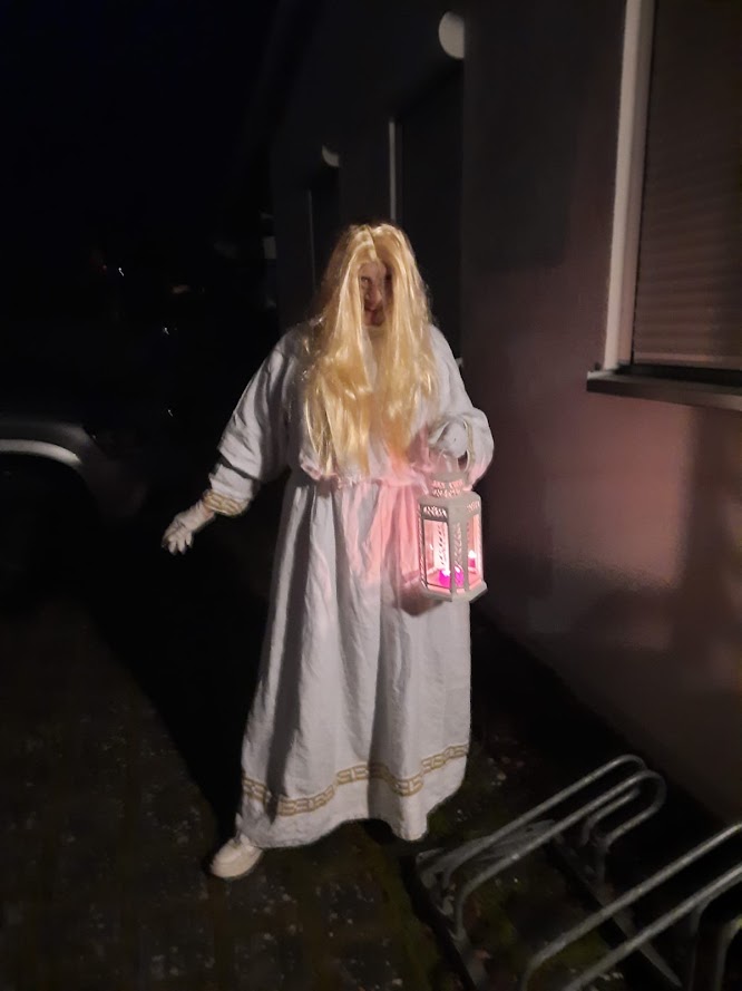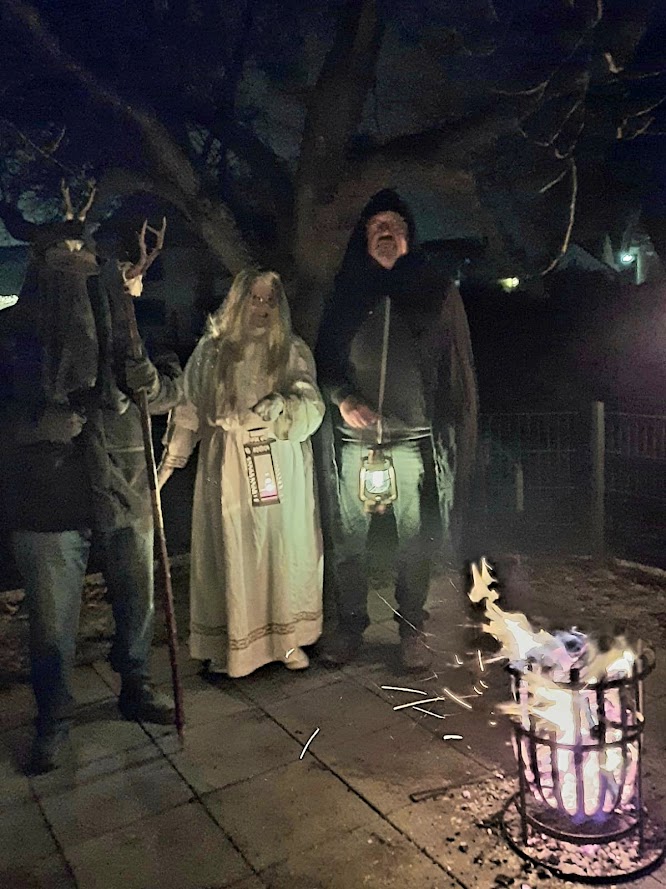 Taschenlampen, führte Franz Bolz die Gruppe durch das nächtliche Allmendingen. Durch die Allee beim Schloss, vorbei am Friedhof, trafen sie auf eine furchterregende Gestalt aus Odins wildem Heer. Dieser verlangte von jedem einen Wegezoll. Weiter zog die Gruppe zum Vereinsheim. Hier tauchte aus dem Dunkeln Frau Holle auf, ebenfalls eine kultige Gestalt aus Odins wildem Heer. Franz Bolz erzählte einiges über Bräuche und Rituale der Rauhnächte. Jeder Teilnehmer konnte jetzt seine Sorgen und Ängste vom alten Jahr auf einen Zettel schreiben und im Feuer verbrennen. Zum Schluß wurde im Vereinsheim noch geräuchert, um die bösen Geister zu vertreiben. Bei Glühwein, Punsch und Würstchen ließ man den Abend ausklingen.
