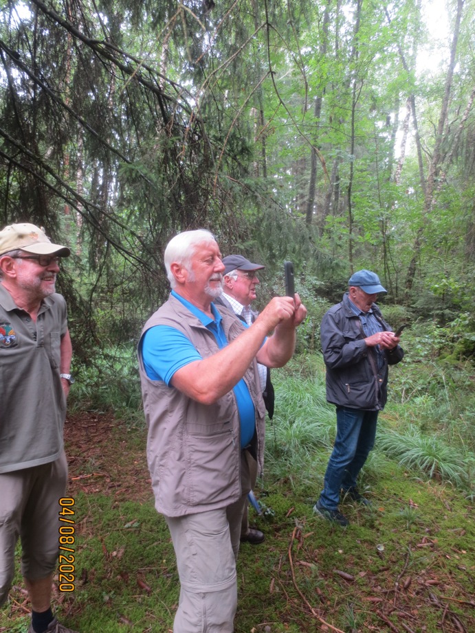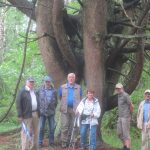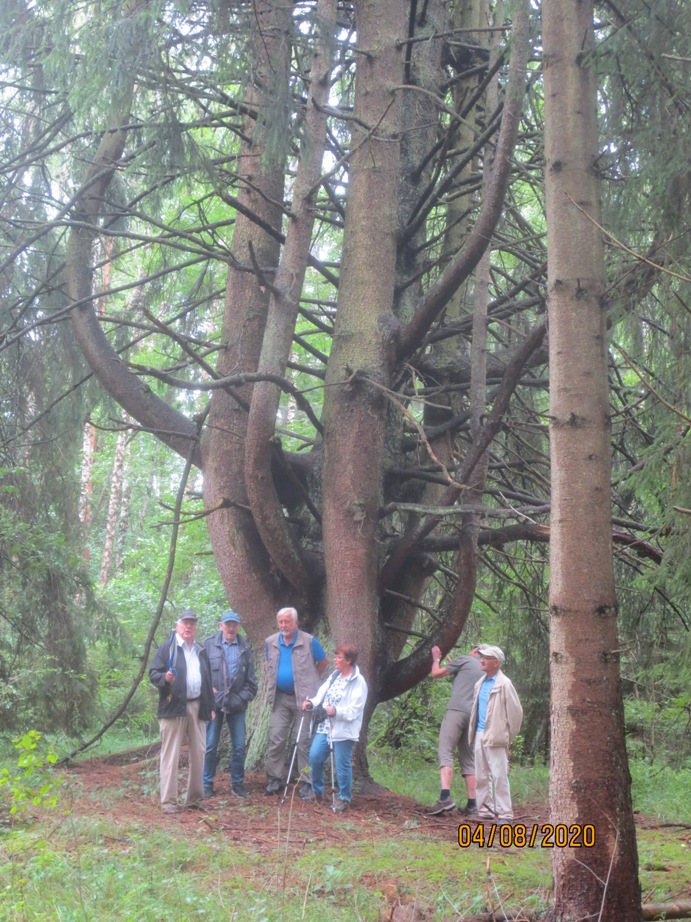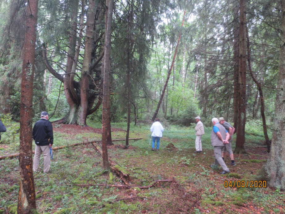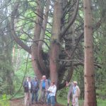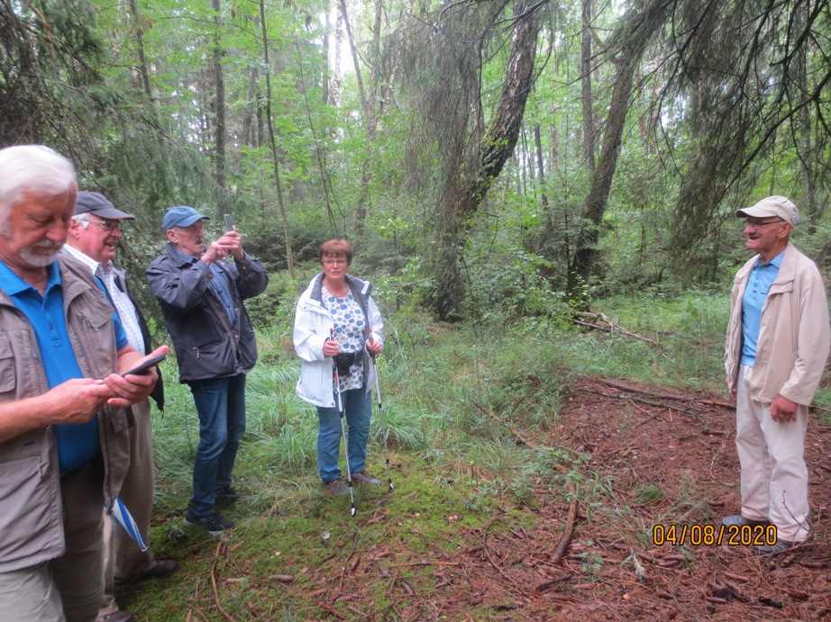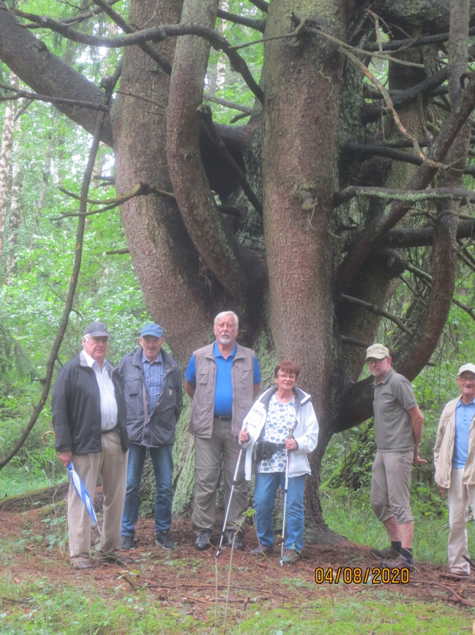 Wanderung mit 6 Frauen und 10 Männer zu der im Mummenlau denkmal geschützten Kiefer. Bewundernswert steht sie im feuchten Baronenwäldchen Mummenlau, oder Umenlau? Wer weiß es?