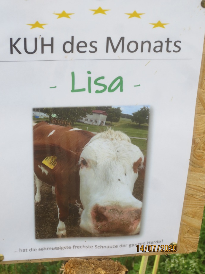 Vom Parkplatz der Fa. Schwenk gingen 9 Wanderer, davon 2 Frauen, an der Weide von Enders (Maurers) vorbei wo die Kuh des Monats grüßte.