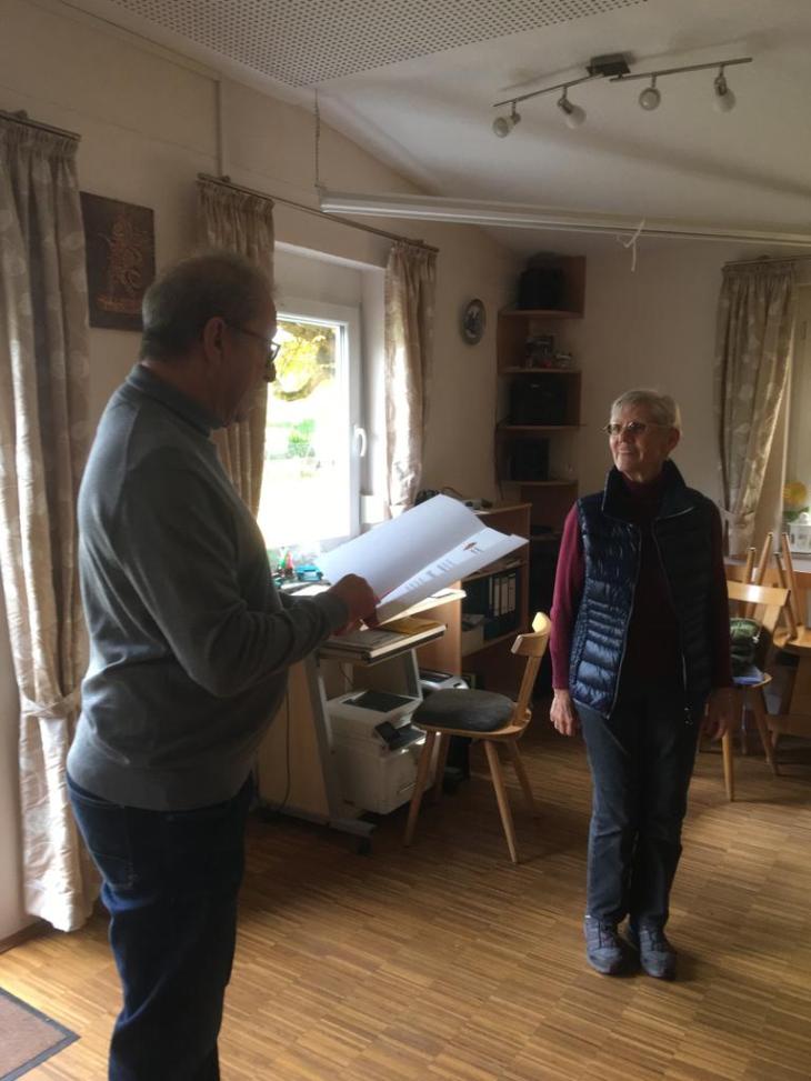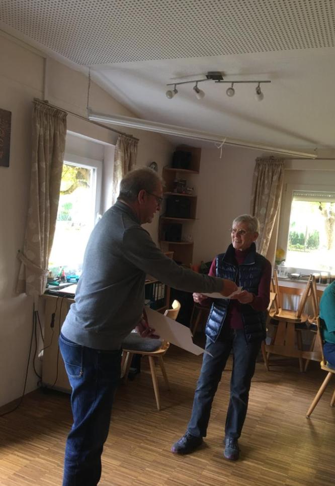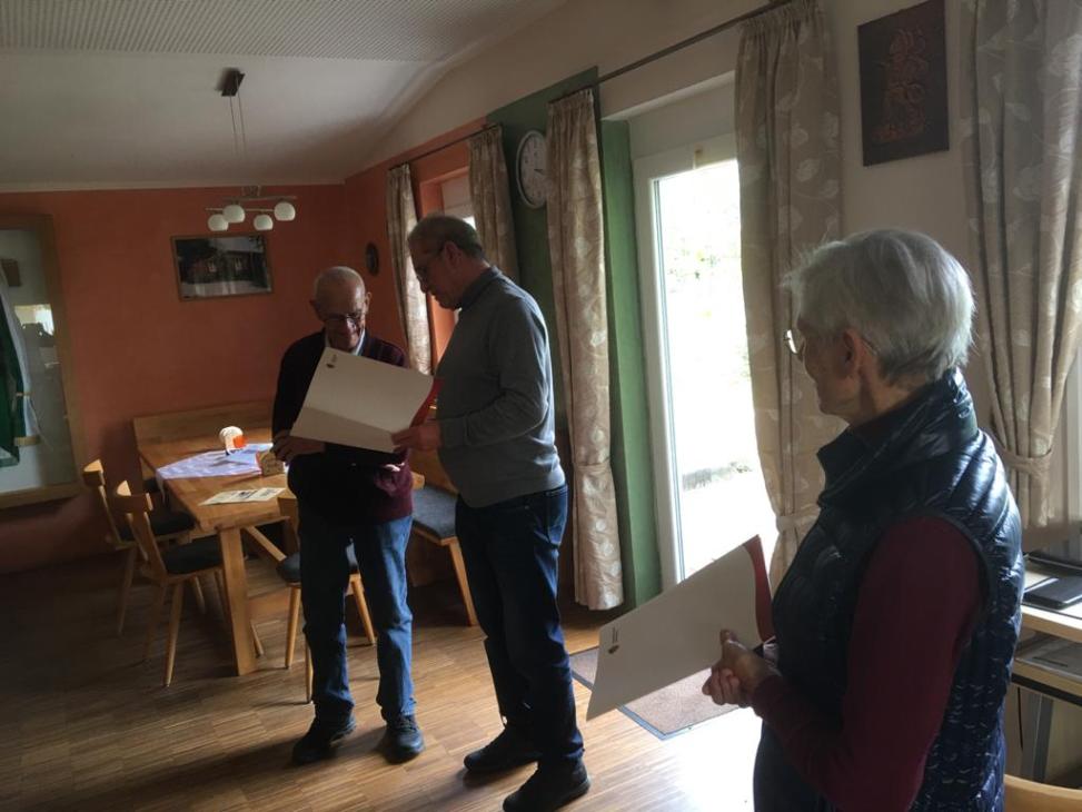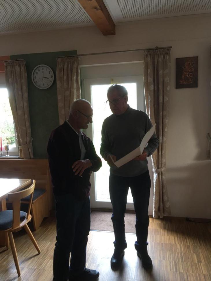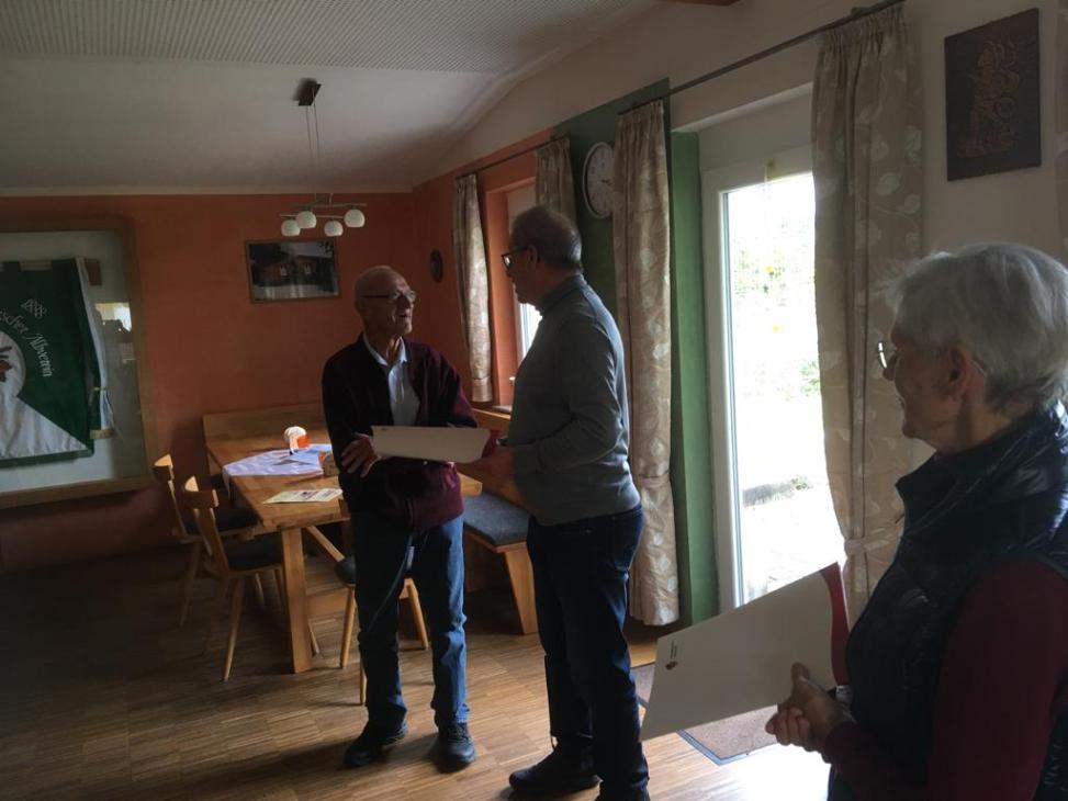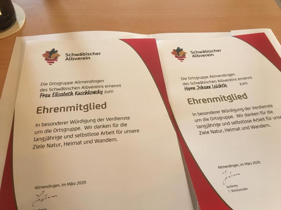 Elli Kuschkowsky und Johann Leichtle wurden von Vorstand Karl-Heinz Juchems zu Ehrenmitgliedern ernannt. Elli Kuschkowsky für ihre langjährige Schriftführung und Aufarbeitung vieler alter und wichtiger Informationen zum Verein das sehr viel Zeitaufwand und Recherche benötigte sowie als eifrige Wandersfrau und Johann Leichtle als ältester aktiver Wandersmann. Beide waren sehr überrascht über ihre Ehrung die aber die richtigen Personen traf. Seit bestehen des Vereins von über 126 Jahren die ersten Ehrenmitglieder.
