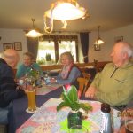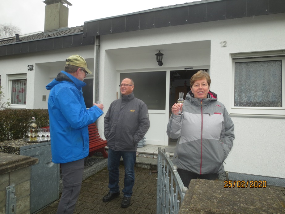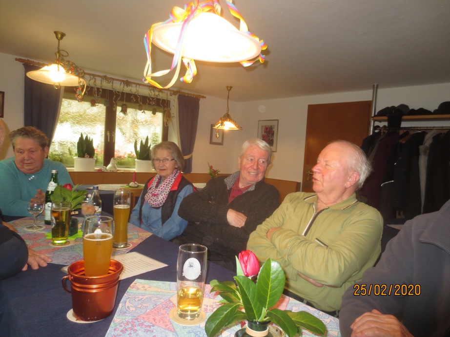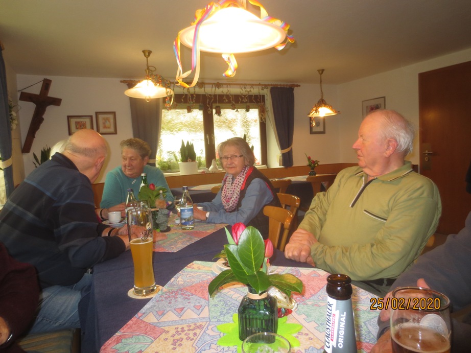 Wanderung im Flecken von Allmendingen zur Einkehr im Kreuz bei Helga. 10 Frauen und 19 Männer waren beim Fasnetsausklang  anwesend, darunter auch Vorstand Karl-Heinz. Auch der 2. Vorstand Manfred war mit Frau dabei, bei dem es am Haus noch ein Schnäpsle gab weil etliche nicht wussten wo Meiers wohnen.
