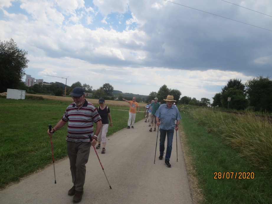 Aufgrund des sehr heißen Tages waren nur 16 Personen zur Wanderung eingetroffen. Vom Vereinsheim gingen wir die Wassergasse lang im Allmendinger Ried. Kurzer Regen unterwegs hinderte die Gruppe nicht daran weiterzugehen, im Gegenteil, dies war eher eine angenehme Abkühlung.
