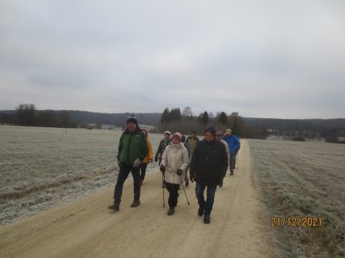Wanderung in und um Allmendingen mit Einkehr in Schmidt`s Bistro. 10 Frauen und 12 Männer wanderten in Allmendingen und drum rum bei trockenem Wetter aber etwas kühl und windig. Dafür war die Einkehr bei Robby um so besser. Leckeren Salat, Pizza, Kartoffelspalten oder belegte Seelen wurden gerne verspreist.