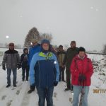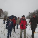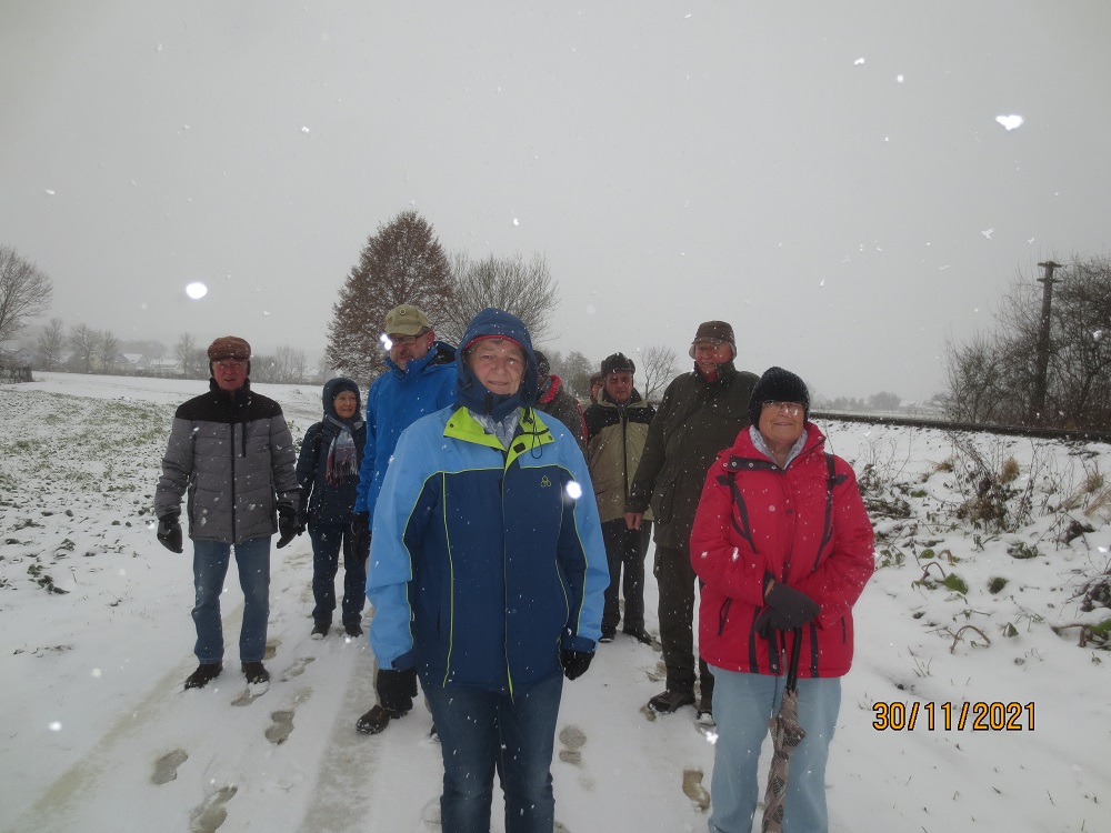 Jubiläumswanderung (20. Wanderung in 2021) bei Regen, Schnee und Sturm. Da laufen nur die erprobten und harten Senioren aus Allmendingen. Dieter Edelmann nahm auch seinen Hund nicht mit bei diesem Sauwetter. Trotz allem waren 10 Frauen und 12 Männer dem Wetter mit guten Schuhen und guter Kleidung entgegengetreten.