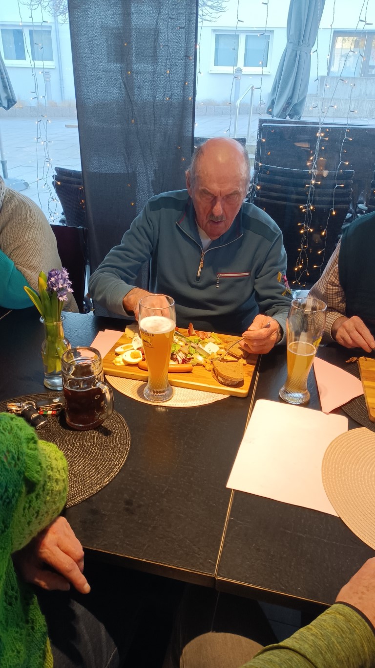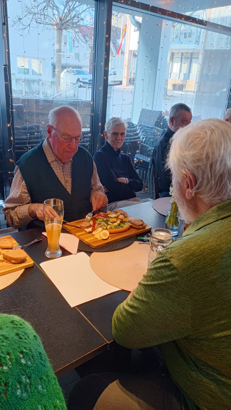8 wanderten bei kaltem aber strahlendem Sonnenschein, den Schmiechener See entlang. 5 davon machten einen Umweg über den Eselberg. Am Schmiechener See kam ihnen Roland John entgegen, der von Nasgenstadt aus gewandert kam. 5 fuhren mit dem Zug, stiegen in Schmiechen aus und wanderten über Urspring, zur Einkehr. Die Restlichen kam mit dem Auto. Im „Messer und Gabel“ wurden wir von Bianca (ehemalige Urspring Caffee Wirtin) gut bedient. Das Essen und Vesper war reichlich und gut.