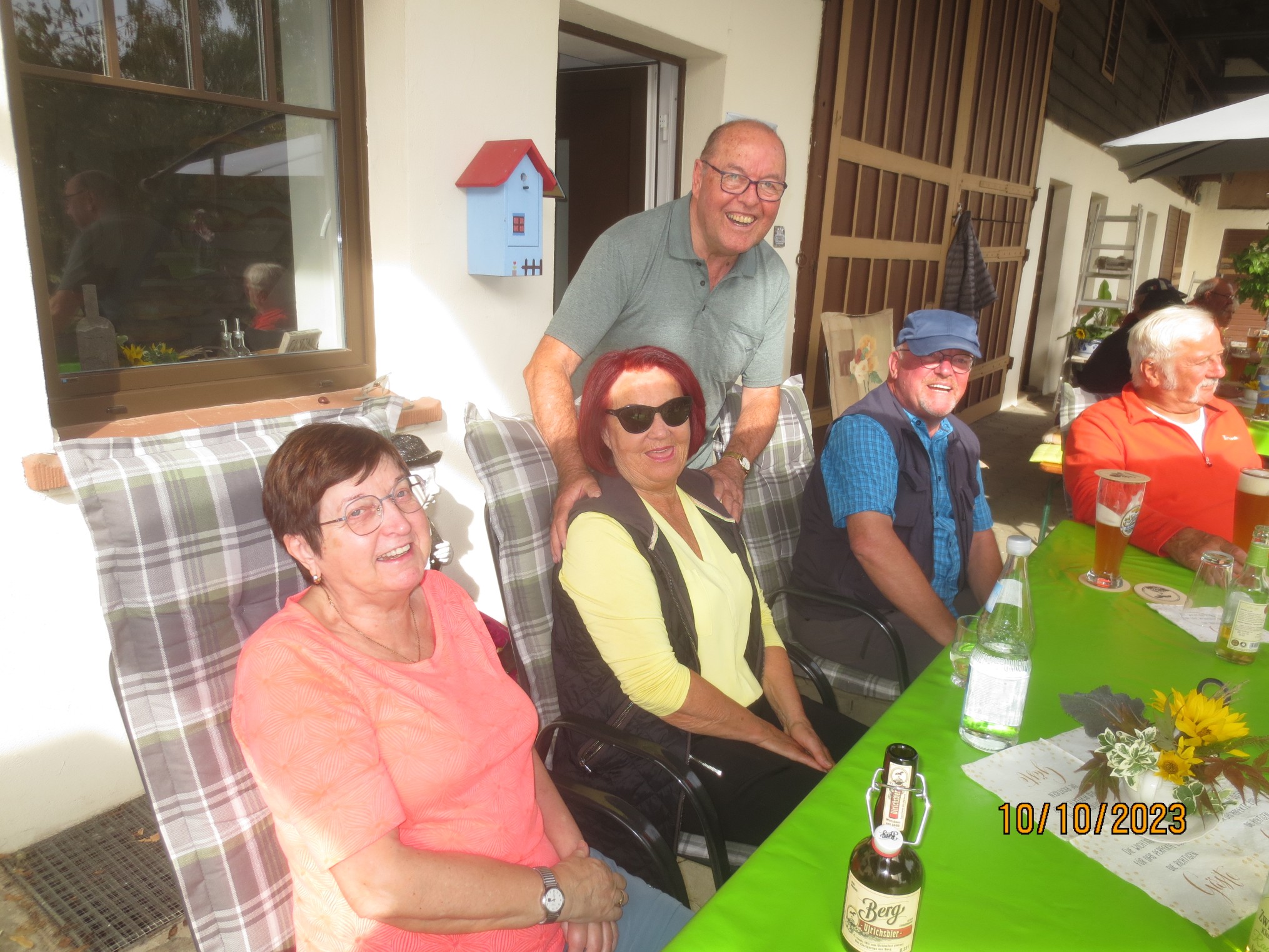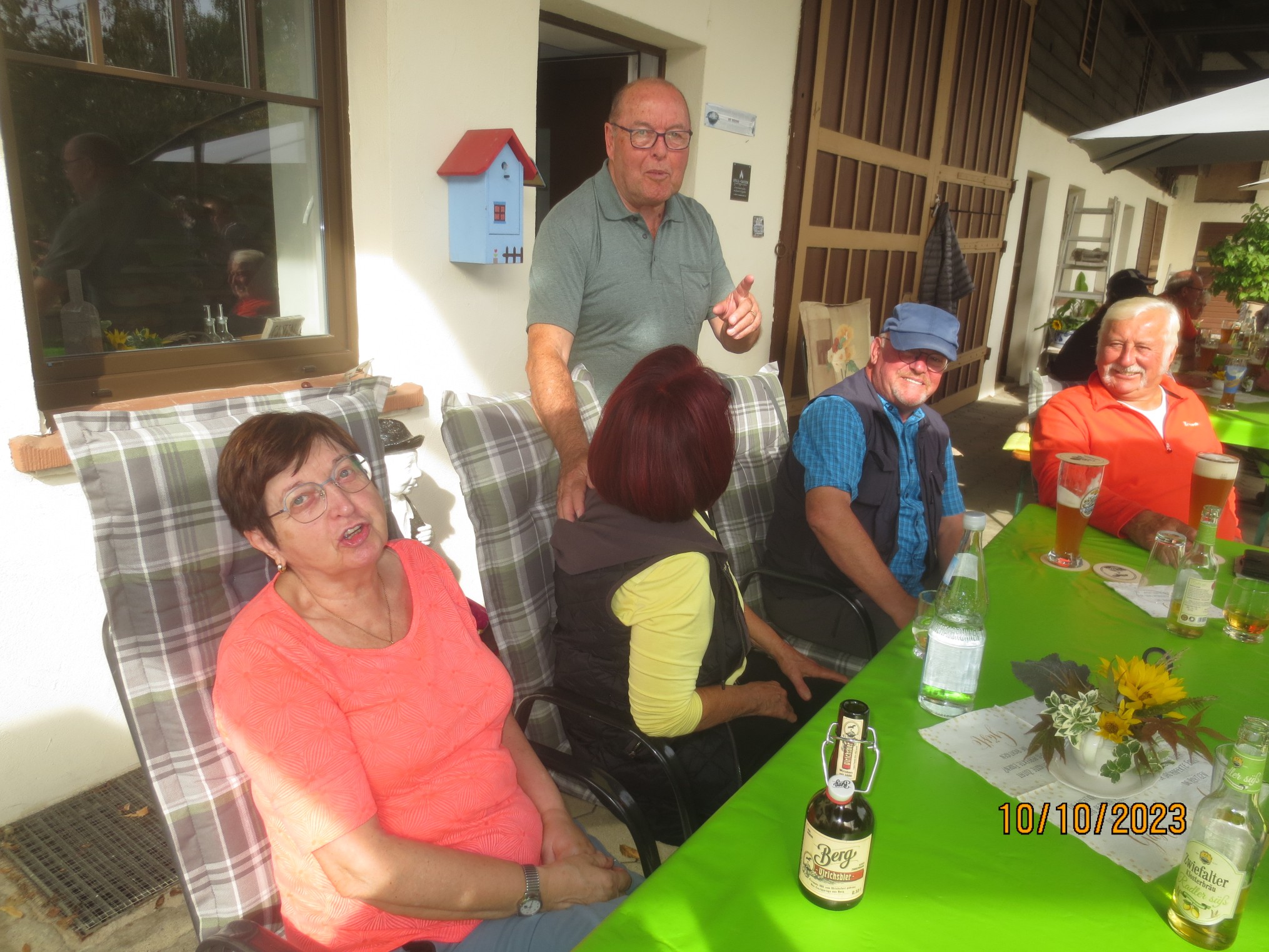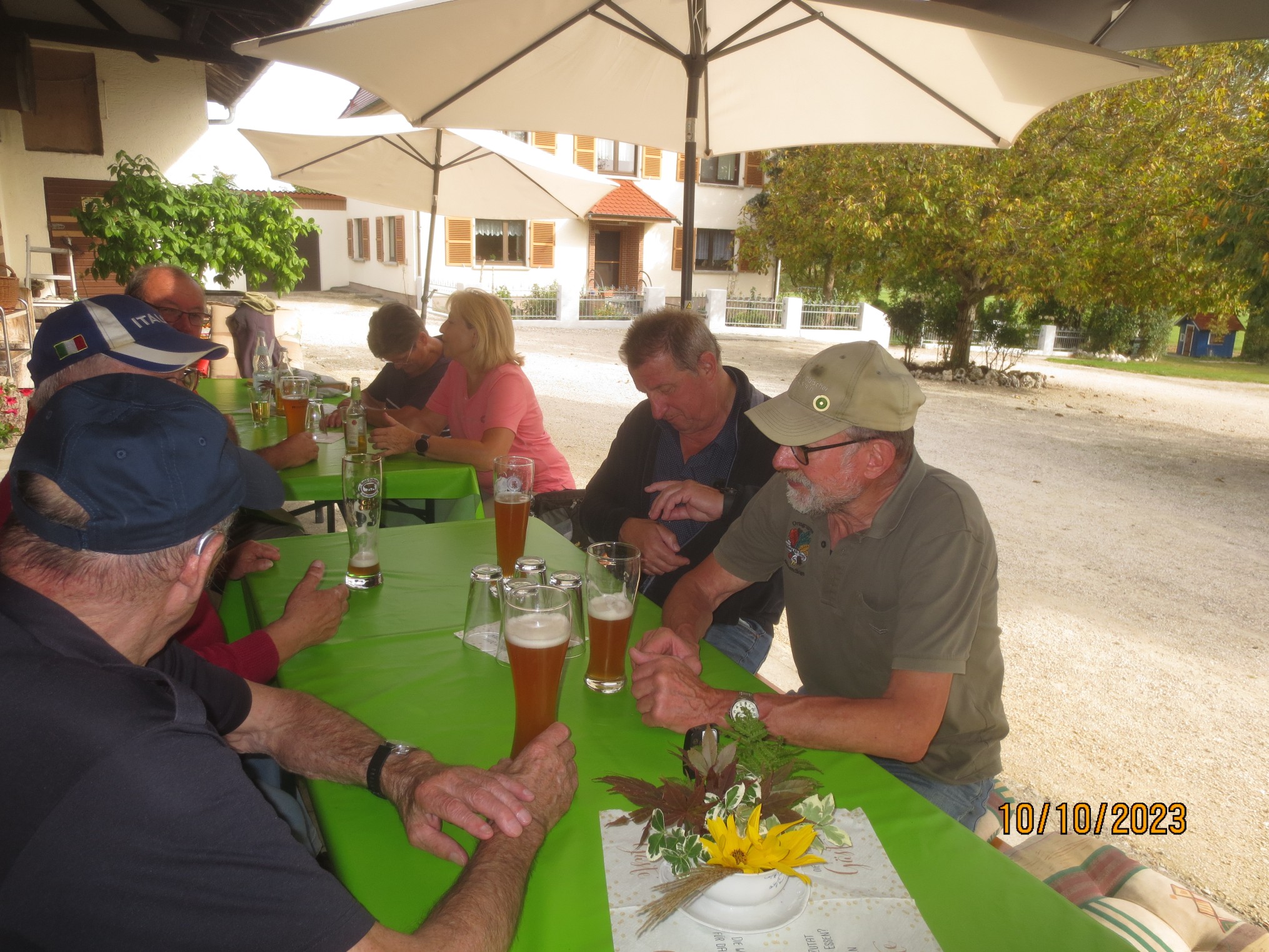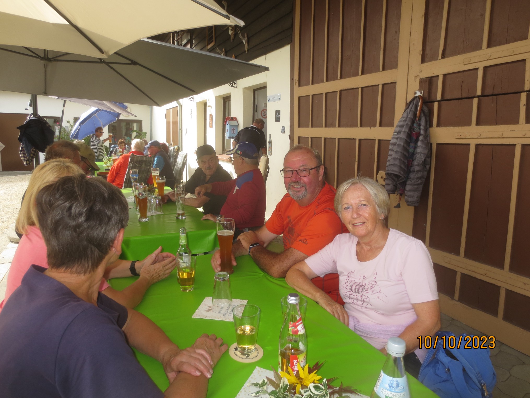 Dienstag 10.10.2023 Wanderung von Rottenacker in das beliebte Hofgut St. Johann zur Einkehr bzw. zu einem Grillnachmittag der Senioren und Albvereinler. Super war das Wanderwetter das ca. 15 Personen mit dem Zug von Allmendingen nach Rottenacker in Anspruch nahmen. Von Rottenacker aus ging es über Stock und Stein zum Teil anspruchsvoll, das Wolfgang Nörpel vorschlug, zum Hofgut. Die Sitz und Grillstation wurde von Dieter Edelmann, Harder Erwin sowie Karlheinz Juchems super vorbereitet. 12 Frauen und 14 Männer freuten sich auf leckeres Fleisch, Wurst und Salate. Eine Auswahl an Getränken war natürlich auch vorhanden. Den Grillmeister übernahm Dieter Edelmann der auch das Fleisch spendete. Die Getränke wurden von Karlheinz Kley übernommen der eine großzügige Spende an den Verein machte. Erwin und der Vorstand sorgten für den flüssigen Nachschub. Die Schnapsprobe wurde von der Chefin verteilt und reichlich angeboten. Leider zu früh mussten wir wieder den Rückweg nach Rottenacker antreten um mit dem Zug nach Allmendingen zu kommen.