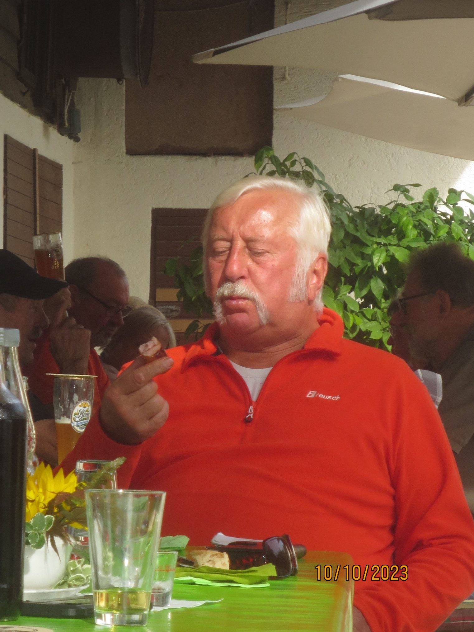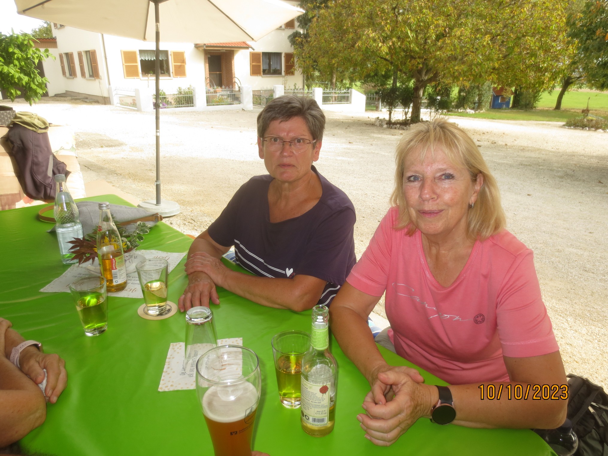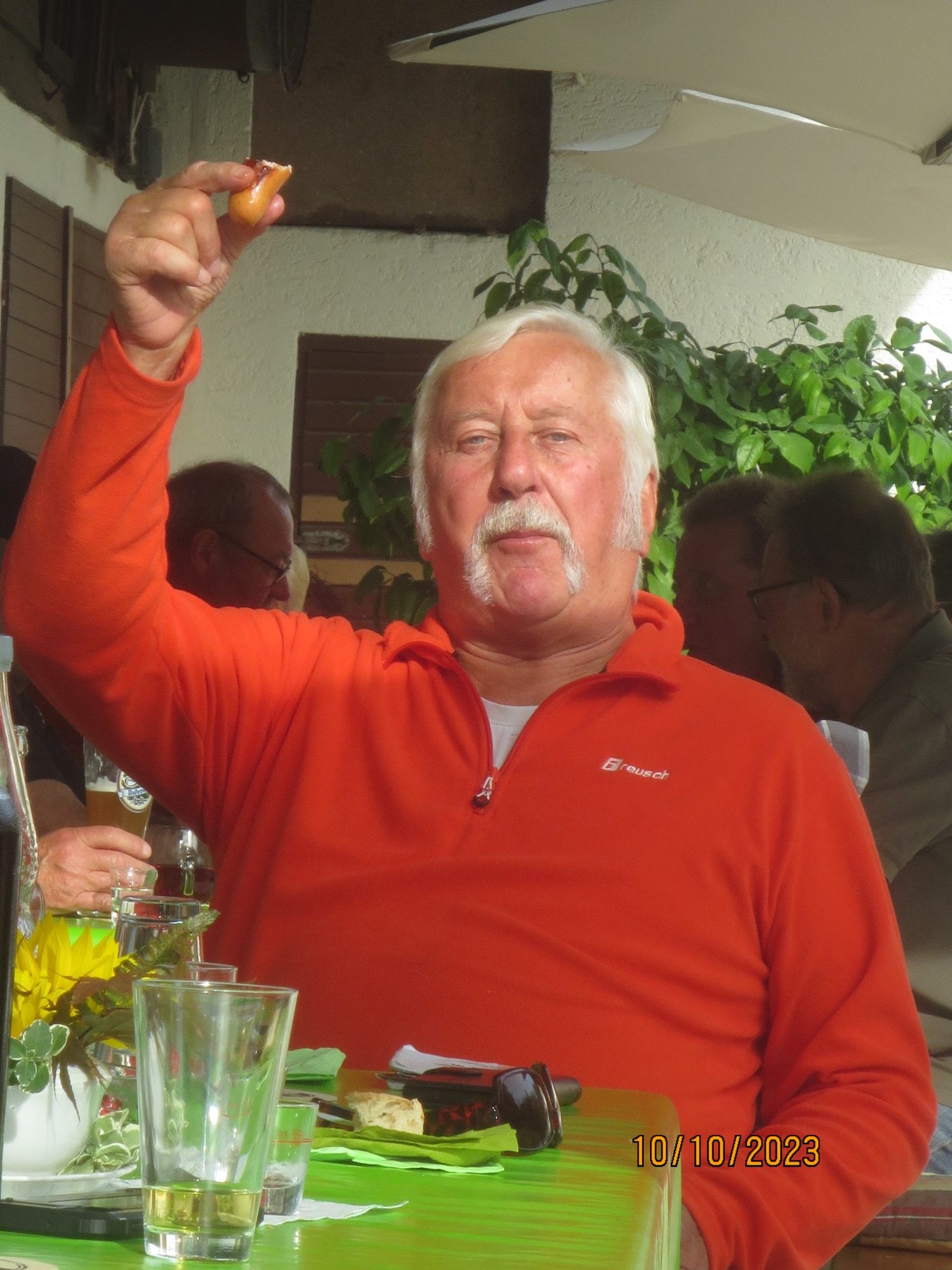 Dienstag 10.10.2023 Wanderung von Rottenacker in das beliebte Hofgut St. Johann zur Einkehr bzw. zu einem Grillnachmittag der Senioren und Albvereinler. Super war das Wanderwetter das ca. 15 Personen mit dem Zug von Allmendingen nach Rottenacker in Anspruch nahmen. Von Rottenacker aus ging es über Stock und Stein zum Teil anspruchsvoll, das Wolfgang Nörpel vorschlug, zum Hofgut. Die Sitz und Grillstation wurde von Dieter Edelmann, Harder Erwin sowie Karlheinz Juchems super vorbereitet. 12 Frauen und 14 Männer freuten sich auf leckeres Fleisch, Wurst und Salate. Eine Auswahl an Getränken war natürlich auch vorhanden. Den Grillmeister übernahm Dieter Edelmann der auch das Fleisch spendete. Die Getränke wurden von Karlheinz Kley übernommen der eine großzügige Spende an den Verein machte. Erwin und der Vorstand sorgten für den flüssigen Nachschub. Die Schnapsprobe wurde von der Chefin verteilt und reichlich angeboten. Leider zu früh mussten wir wieder den Rückweg nach Rottenacker antreten um mit dem Zug nach Allmendingen zu kommen.