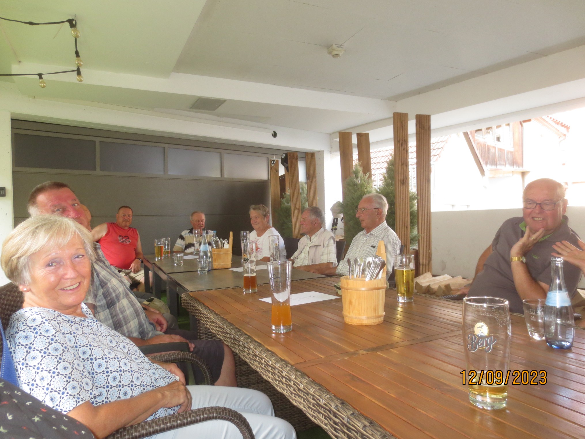 Wanderung nach Ehingen bei hochsommerlichen Temperaturen über Berkach bzw. das Maientäle, Verkehrsübungsplatz, der Firma Liebhherr,  zur Einkehr in Paulas Alb. 9 Frauen und 10 Männer überwanden den häuslichen Alltag und freuten sich auf einen geselligen Mittag bei kühlen Getränken und leckerem Vesper unter den Albverein Senioren. Zurück fuhren wir mit dem Zug. Allerdings eine Stunde früher,  wegen dem aufziehendem Gewitter. Karlheinz Juchems freute sich im Albvereinsheim über die frühen Seniorengästen, die noch Stimmung, Umsatz und volle Stühle brachten.