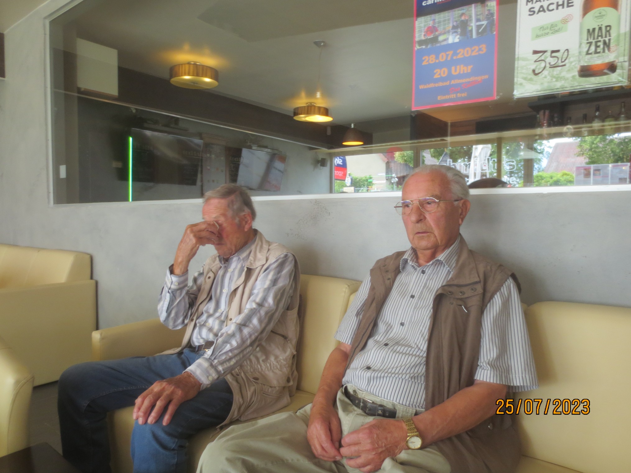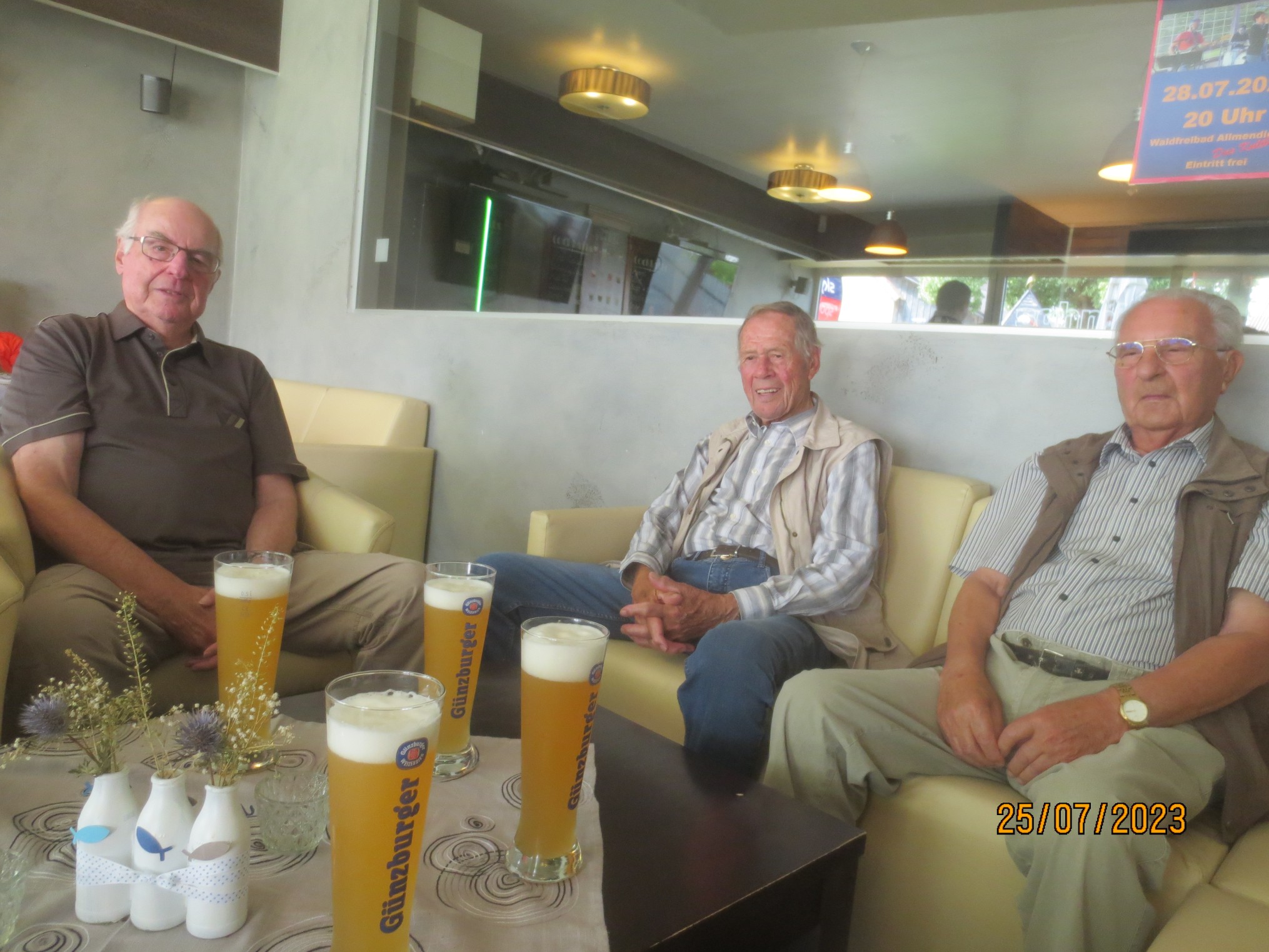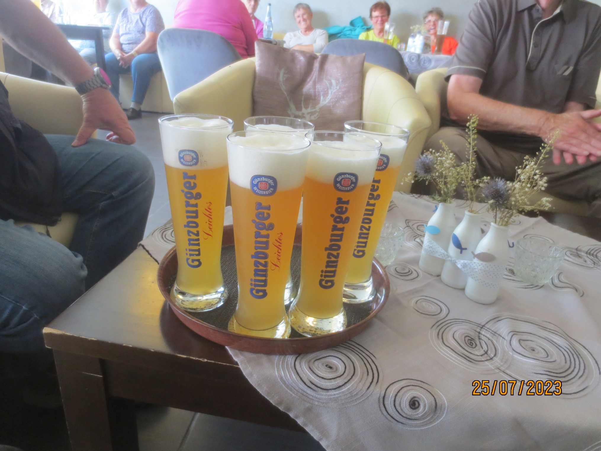 Wanderung in unserem schönen Allmendingen mit 7 Frauen und 11 Männern bei kühlem und regnerischem Wetter, aber alle gut gelaunt. Eine kleine in 3 Gruppen starke Wanderschar erkundete, mit kleinen Regenschauern versüßt, Allmendingen. Einkehr war bei dem frohgelaunten Wirt Robby in seinem Bistro. Getränke und Speisen wurden super und bestens gereicht.