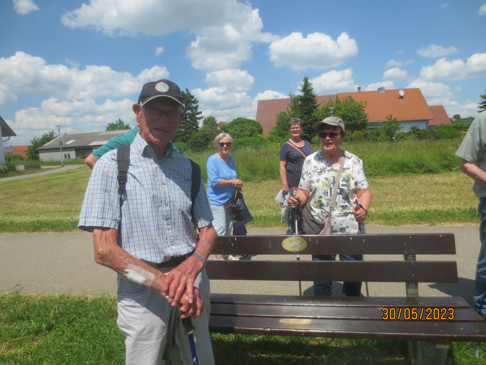 Wanderung nach Ehingen über Hausen, mit Abstecher bei Karlheinz, bzw. von Schule Marienstraße über Berkach, bzw. in Ehingen selbst zur Einkehr im Gasthaus Ochsen. Herrlicher Sonnenschein begleitete die Senioren auf Ihren Wegen. Auch unser ältester Mitwanderer und Ehrenmitglied Johann Leichtle lief über Berkach nach Ehingen. 10 Frauen und 16 Männer genossen anschließend den herrlichen Freisitz im Ochsen, die kühlen Getränke, das gute Essen. Die Rückkehr erfolgte mit dem Zug bzw. auch wieder zu Fuß.